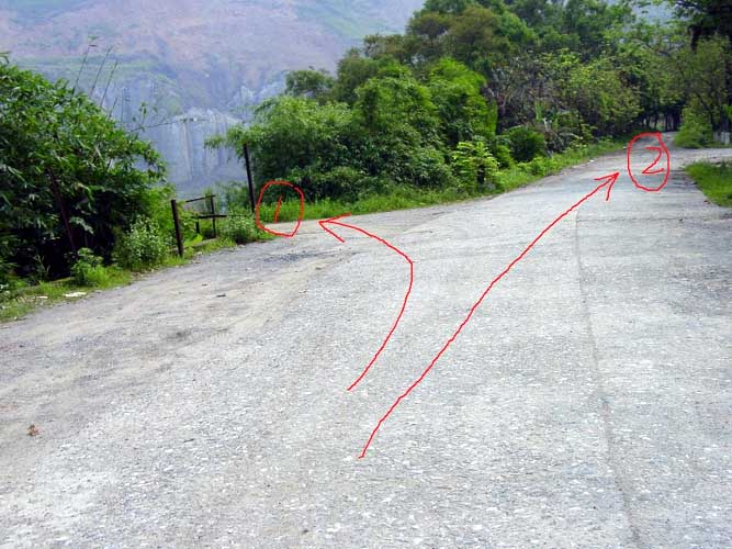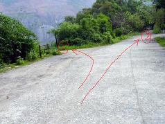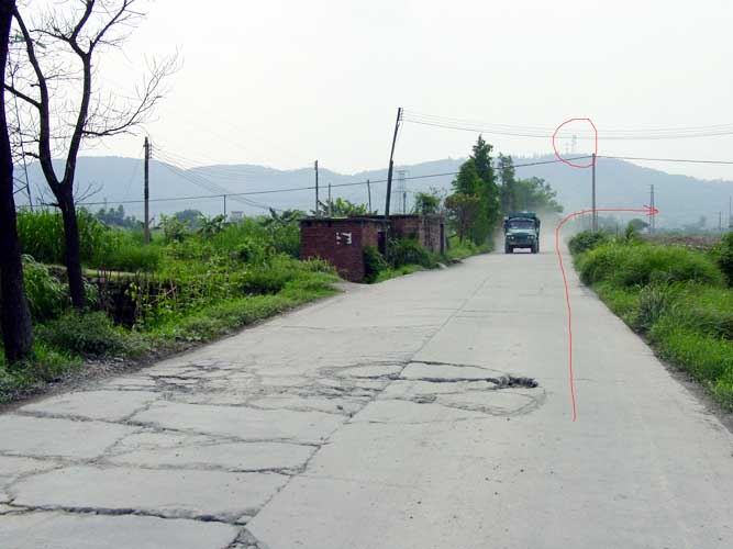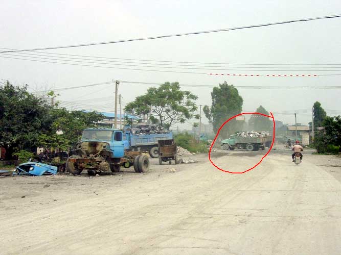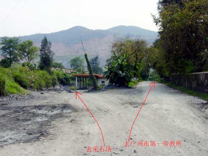 ![]() 这里是劳教所附近的一个水泥厂在运石头,以前2000年以前这些石头都是人工(劳教人员)往汽车上一个一个的搬的。 | ![]() 拐过了路口就快要到了,顺着箭头指着的方向转过去就到了;那个汽车是从采石场运石头的。 |
