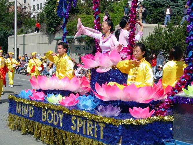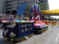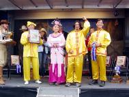 ![]() 法轮大法学员代表在授奖仪式上 | ![]() 游行队伍中的功法演示 | ![]() 法轮功学员表演莲花舞 |