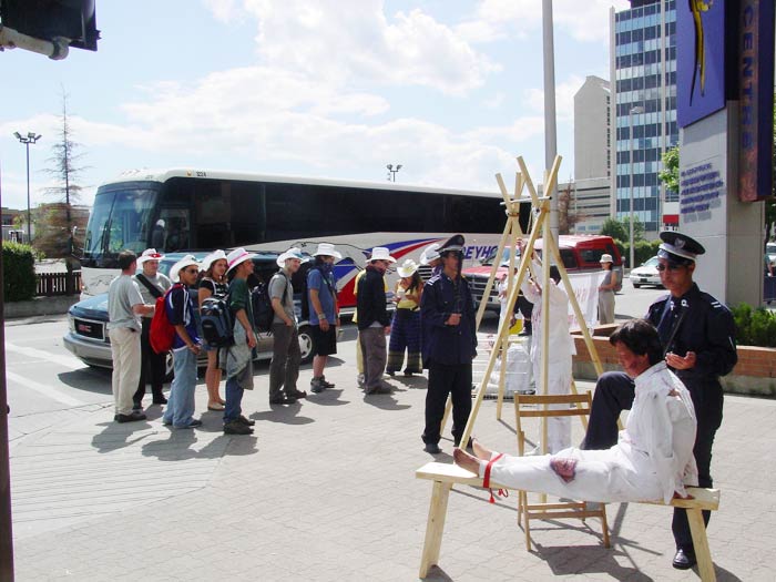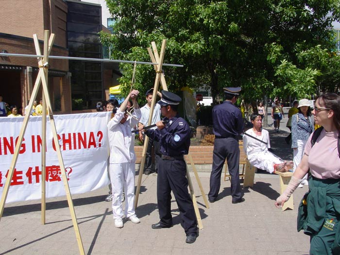 FFWD的摄影记者也到现场进行了采访,并拍摄了大量酷刑场面的照片,包括各种特写。法轮功学员介绍说,这次酷刑展上表现的是正在中国大陆发生的事情,因为有许许多多的酷刑无法在公众场合展示,所以,我们所模拟的只是很小的一部分。到今天为止,已经核实的在中国大陆直接被迫害致死的法轮功学员已经达到了1000人,十多万人被非法关押、劳教和判刑。
