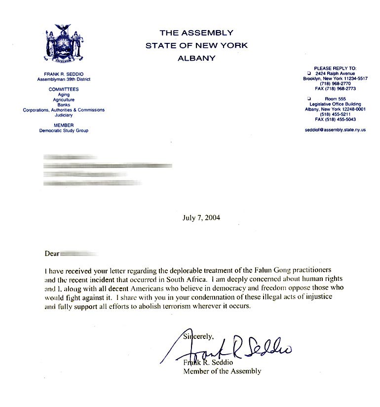 【明慧网2004年7月12日】纽约州39区州议员弗兰克·赛都(Frank R. Seddio)2004年7月7日写信给纽约的法轮功学员,表达他对南非枪击事件的强烈关注和对这种恐怖主义行径的谴责。