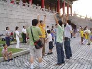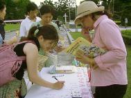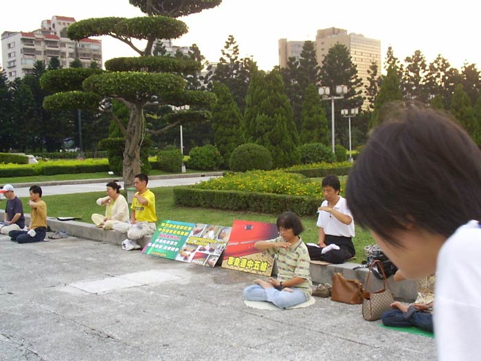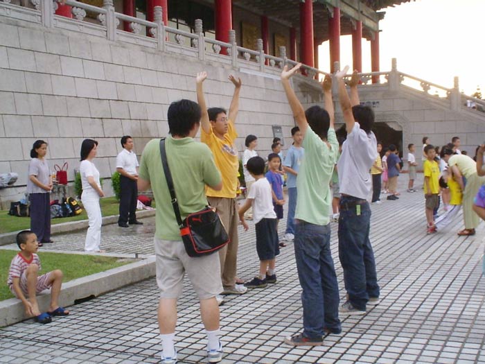 下午征签时,有的学员展示五套功法,有的学员发传单讲真象,一个老奶奶带着孙女走过来,小孙女问奶奶:这是什么?奶奶回答:炼功身体好,心地也会好。周日傍晚正好也是台北明慧学校小弟子的户外洪法炼功时间,一个大人跟他的孩子说:台湾可以自由炼功,我们去炼功。随后就带着孩子去明慧小弟子班那里学功。