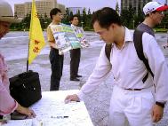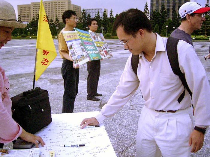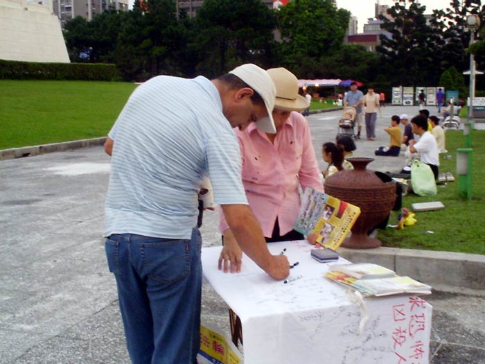法轮功学员向民众细致深入的讲清真象:法轮功是一种使人身心健康的功法,教人做好人的功法,全世界上亿人修炼,受到各国的欢迎,却在大陆受到打压。江氏集团迫害法轮功的手段十分残暴,上千人被迫害致死,被关押和流离失所的不计其数,所以那些迫害法轮功的高官陆续在世界各国被告上法庭。这次迫害法轮功的江氏集团主要成员曾庆红到访南非,来自澳洲的几位法轮功学员得知消息后,就飞抵南非和平抗议并欲寻求法律途径,起诉曾庆红。但是澳洲学员才下飞机就在高速公路上就被枪击重伤,种种迹象表明是明显的雇凶杀人。江氏流氓集团的暴力恐怖主义已经延伸到了海外,台湾善良的法轮功学员被迫害的也不少,如去年林晓凯到大陆被抓,被精神虐待等。如果纵容江氏集团的这种恐怖行为,受害的将不仅仅是法轮功学员,如果我们再不重视,不共同制止江氏集团的罪行,那我们的生命就没有保障,一些原本不太关注的民众听了也纷纷签名支持。