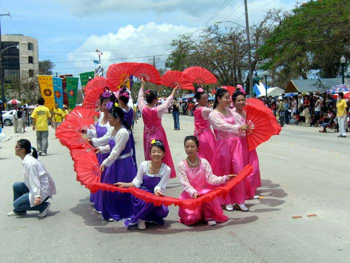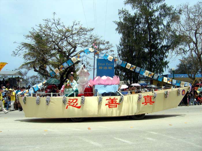 塞班岛很热,平常看不到什么人。但游行当天,道路两旁挤满了成千上万的游客和当地土著,似在迎接大法的到来。当他们看到法船上扮相庄严的菩萨和散花仙女,还有舞姿曼妙的扇子舞仙女时,莫不感到惊奇!还抢着一起拍合照呢!
