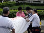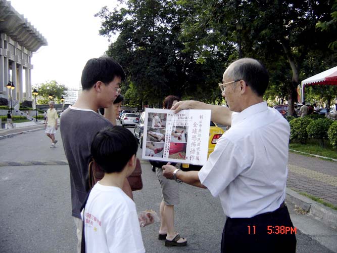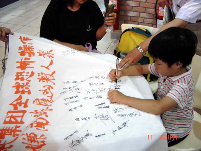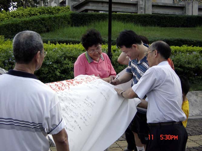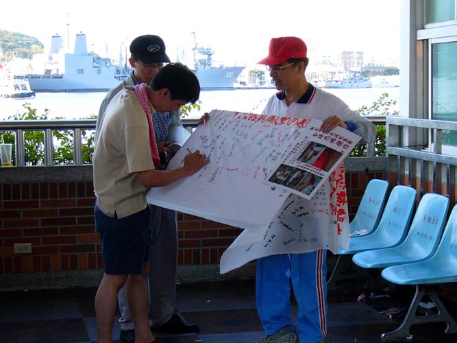 学员们在高雄市火车站、凤山火车站、美术馆、旗津海岸公园、高雄文化中心等人潮多的地点,征求民众的签名支持正义,反对江氏集团恐怖主义行径。有的拿着醒目的看板写着“反对江氏国家恐怖主义”;有的分发法轮大法真象材料,一面解说大法洪传世界,只有江氏集团对法轮功残酷的迫害,获得了民众的热烈反响。一位带着幼稚园小孩的妈妈说,虽然她个人的力量很小,但是她愿意支持反恐。不论老少,几乎看到、听到的所有善良的台湾人都签下了正义的大名。