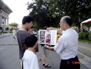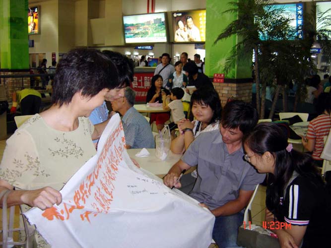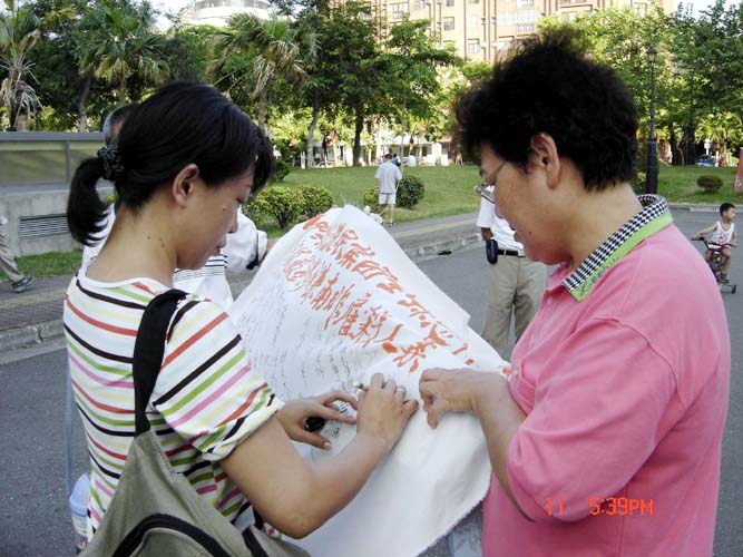 另外有一位太太看到签名条,还没等法轮功学员解释,毫不犹豫就签上名字,她向学员表示她先生是台商,她认为大陆是一个让人没有安全感的地方。她曾经有台商朋友被大陆公安绑架,并被勒索几十万人民币才放人。她也看过大陆电视上有关污蔑法轮功的新闻,她对这种打压法轮功的做法很不以为然。另外她也希望台湾媒体能够加强对中国大陆的深入报导,才能让台湾民众有更深刻的了解。