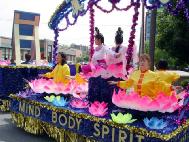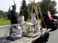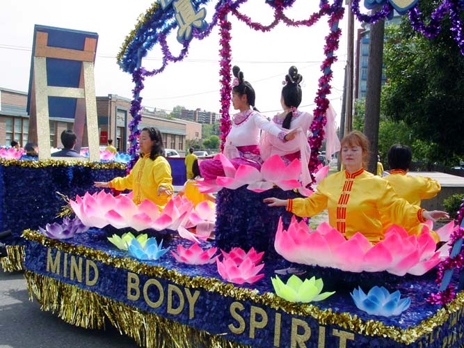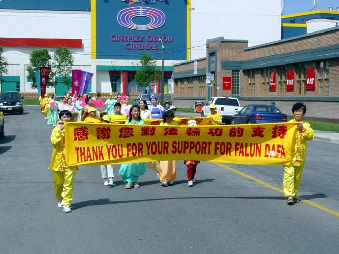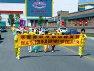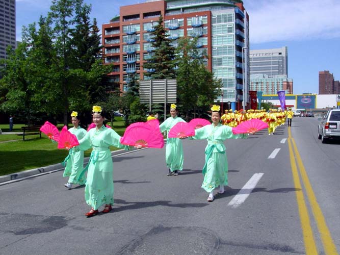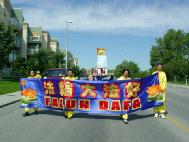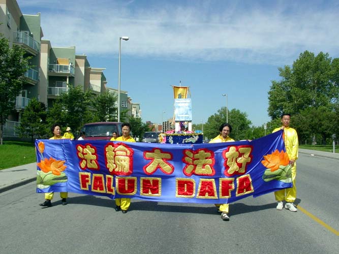 继7月9日在卡尔加里牛仔节上的出色表现,第二天法轮功学员在卡城的中国城举行了盛大的游行。这是一支由加拿大卡尔加里、温哥华、埃德蒙顿、瑞贾纳、多伦多等地的部分法轮功学员组成的游行队伍。队伍由“法轮大法好”、“真善忍”横幅开道,紧随其后的是花车、功法表演、酷刑展、大法小弟子、舞蹈队和腰鼓队,分成三个主题,向人们展示了法轮大法的洪传、在中国大陆受迫害、以及大法给人们带来的美好和希望。