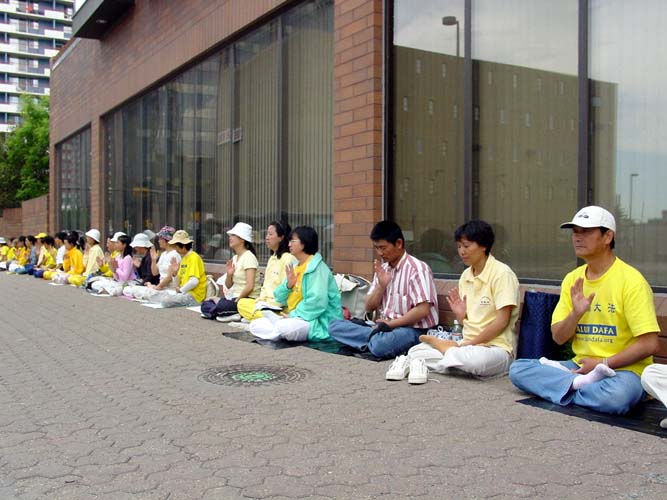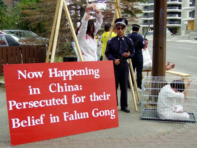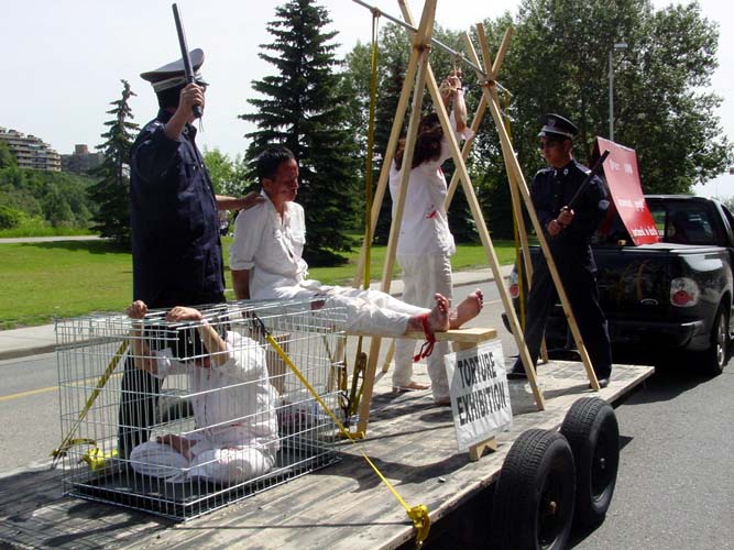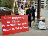 ![]() 游行中的观众 | ![]() 领馆前的酷刑展示 | ![]() 领馆前的和平请愿 |