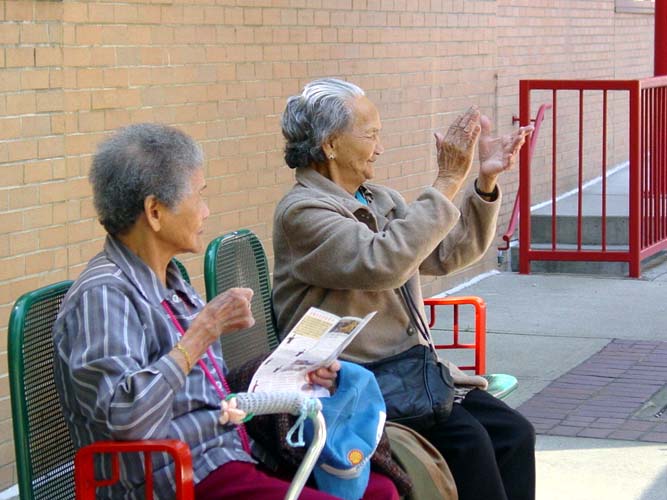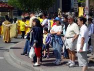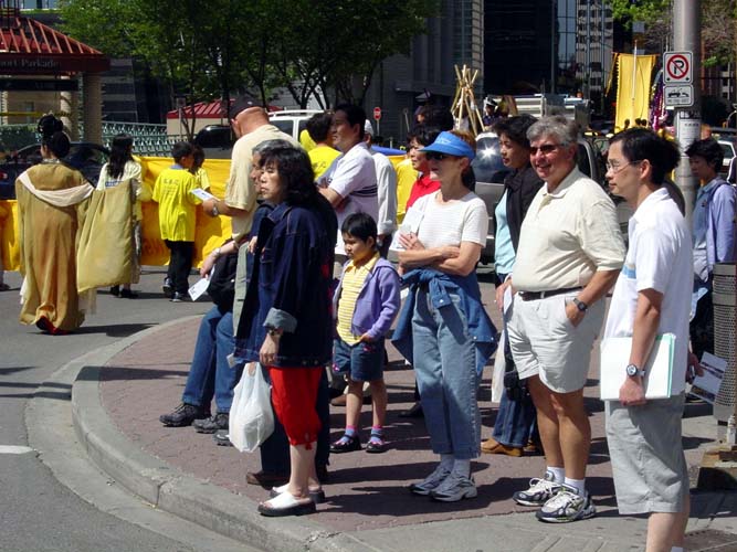 沿路上,法轮功学员一边介绍法轮大法以及在中国受迫害的情况、一边发放真象传单。无论是西人还是华人观众都被吸引,或是停下脚步,或是停下手中的活,或是向游行队伍招手和鼓掌,或是拿出摄像机录下了这浩大的场面,等等。当游行队伍行進到中国城的华人聚集地时,很多华人不禁惊叹:原来法轮功有那么多人炼呢,还有那么多洋人和小孩!人们都愉快的接过了传单。