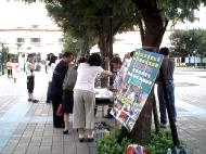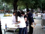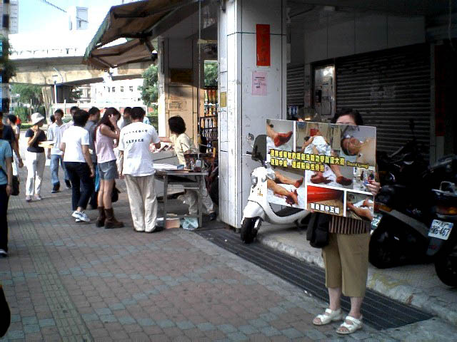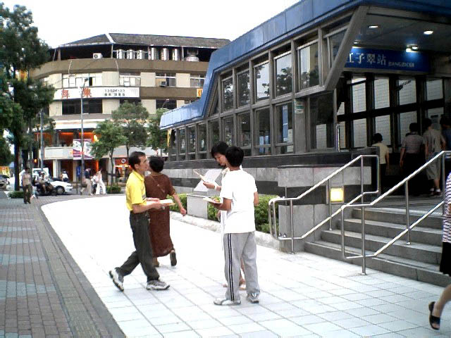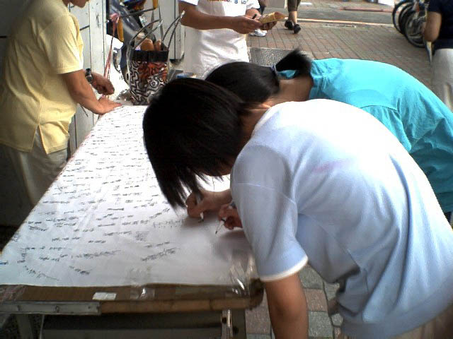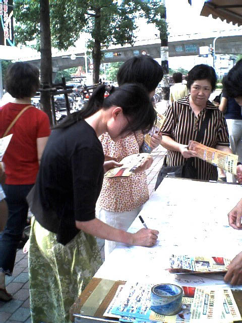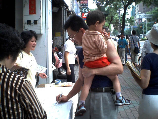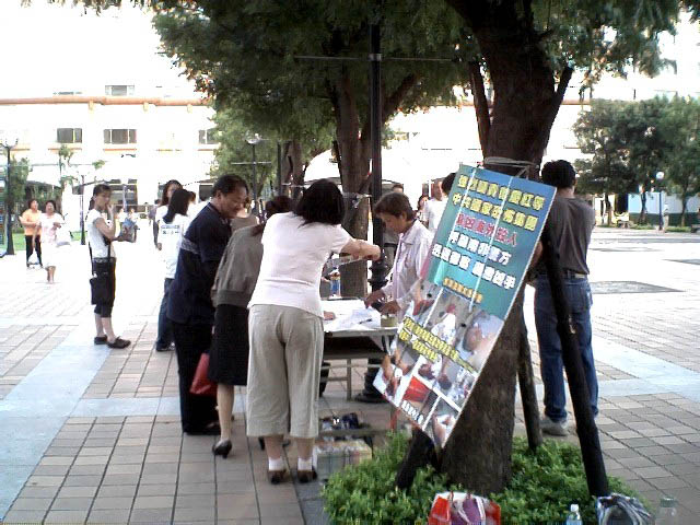 为了制止江氏集团对海外伸出黑手继续作恶,也为了让更多的世人明白,江氏集团迫害法轮功手段残暴已达丧心病狂的程度,随时都可能以同样的手法在海外雇凶杀人,危害全世界,为了维护正义及道德良知,周日(2004年7月11日)下午,台北法轮功学员在板桥捷运站及火车站等人潮多的地方举行征签活动,让更多台湾民众知道这场南非枪击事件的发生及江氏集团对信仰“真、善、忍”的法轮功学员的迫害。