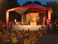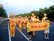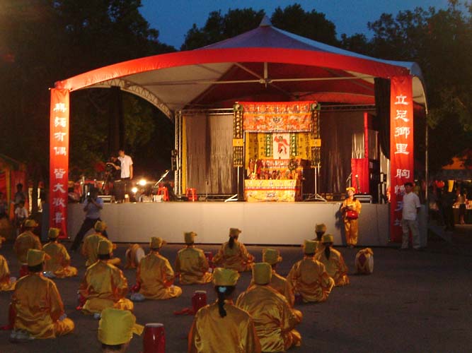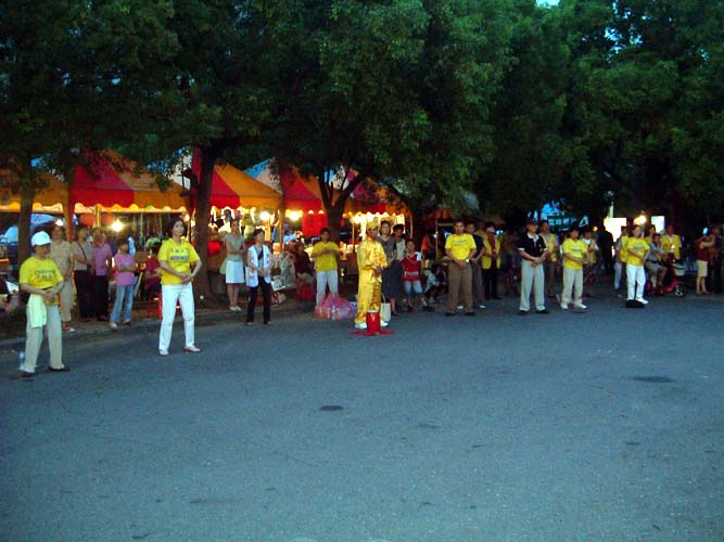 ![]() 功法表演时,场外的法轮功学员及部分民众也开始一起炼功 | ![]() 法轮功学员们的动作整齐,场上祥和 | ![]() 国际偶戏节开幕的第一个节目--法轮功功法表演 |