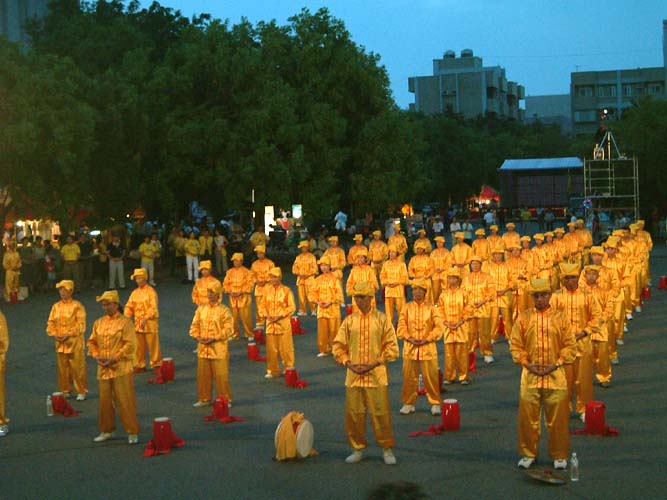 约到了傍晚六时半,所有游行队伍抵达终点站--斗六文化中心。法轮功学员的五套功法表演是晚上的第一个节目,首先由云林的学员代表作功法简介,并说明江氏集团迫害法轮功的真象,随即便开始表演。