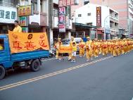法轮功的腰鼓队雄姿飒爽,鼓声震邪,一進到踩街起点─斗六火车站便吸引住所有人的目光。主办单位将亮丽的腰鼓队排在游行队伍的前端,约在下午四时半准时出发,“法轮大法好”的歌声也随着腰鼓队响彻斗六市的大街小巷。