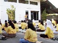 梭罗在印尼爪哇岛中部。在梭罗市郊,有一家拥有两百多名职工的私企纺织厂。两年前工厂主人在电视上看到了有关法轮功的消息,因此打开电脑了解事实真象后,联络法轮功学员而得法,得法后,把工厂职工带动起来,集体炼功学法。他们分成上下午两班,每天在上班前和下班后集在一起炼功和听法。因为当时印尼文版的《转法轮》缺乏,所以每天由辅导员读《转法轮》里的一个章节(比较长的分成几次读)给大家听。这样,时间久了,职工们的心性提高了,身体素质提高了,工作效率也好了,精神面貌改变了,两年来他们听完了七遍《转法轮》。还没炼功之前,大家工作不很认真,烟头纸屑随处丢,不注意卫生,炼功后大家都能够自律,而且还把宝贵的功法带回家去,教左邻右舍炼功,就这样,他们在附近也组织了几个炼功点,大人小孩跟着一起炼。