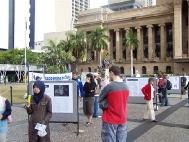 有个年轻人,名叫麦克,他原准备去市中心买音乐光碟,喝点啤酒,轻轻松松的玩一天。可是,看到酷刑展后,他的心情一下子沉重起来,受到了很大的震撼。他仔细的看了介绍,并跟学员长谈。他说:“这个展览冲击着人们的心灵,如果不是这些触目惊心的酷刑展示,我可能就走过去了。你们做得好,就是要强调残酷的现实,让人们了解到这场迫害有多深,有多黑暗!可能我今天一天心情都会很沉重。虽然我并不希望心情沉重,但我宁肯心情沉重,并在你们的征签簿上签名,也不愿意当个无知的糊涂人。”