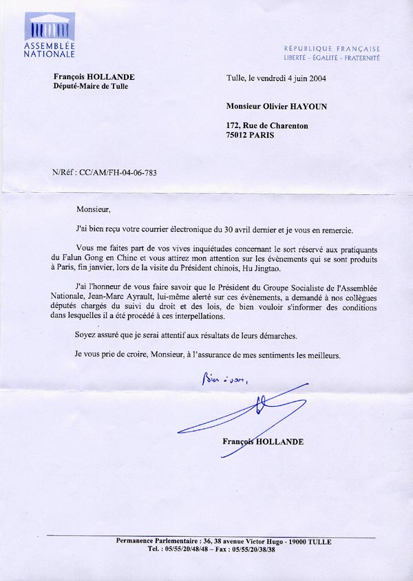 不久前,法国社会党第一书记、国会议员弗朗索瓦•奥朗德先生给法轮功学员回函表示,国民议会社会党团主席已要求其负责权利和法律事务的议员关注此事。回函全文如下: