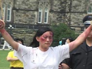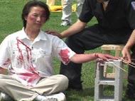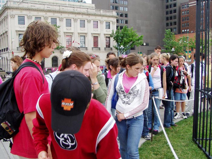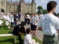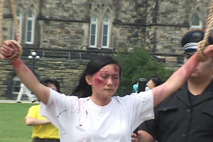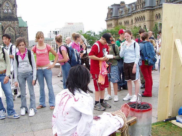 当天的酷刑展在国会山吸引了如潮的观众。善良的加拿大人被眼前的景象震惊了。两位来自加拿大外省的女孩在接受采访时表示,无法相信这样残酷的事情正在中国发生。法轮功学员何立志也是酷刑受害者之一。他在国内因为拒绝所谓的“转化”,曾被监狱警察用上万伏的电棍电击和长时间的体罚。
