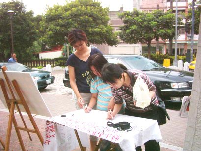 ![]() 签名支持与围观的民众 | ![]() 一家人共同签名 | ![]() 征签摊位与真象看板 |