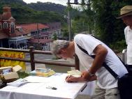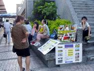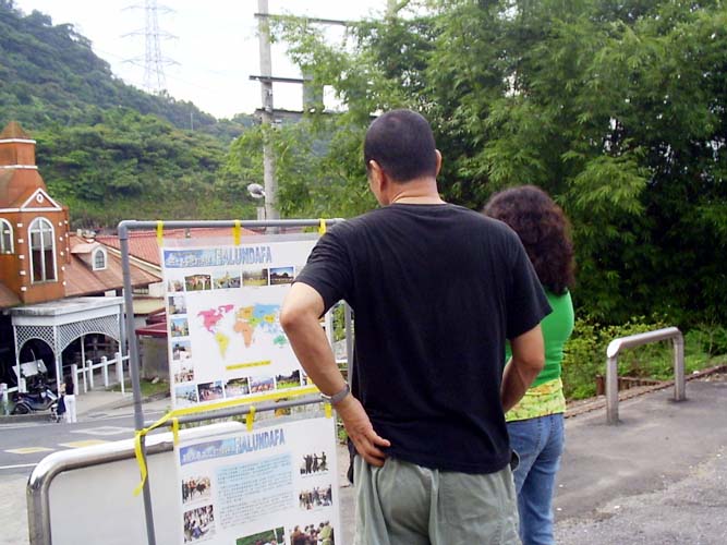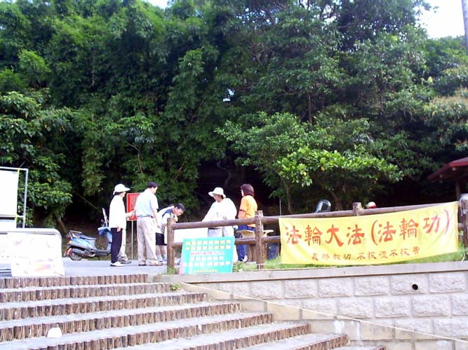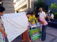 有一位先生说他是跑船的,常去大陆,他很清楚情况,那里高压统治,人民没有自由,法轮功炼功锻炼身体很好,但在大陆当初太受欢迎了,太多人炼了,江氏集团就见不得人好,就要铲除你。他觉得大陆很多人很可怜,头脑被洗得很干净,以前6.4天安门杀那么多学生,他拿台湾报纸去给他们看,那些人不相信还说是台湾造假新闻。学员请这位先生再去大陆时别忘了把法轮功真象告诉人们,他说有讲啊!与学员聊完后就马上签名,他说这是维护基本人权,一定要签。