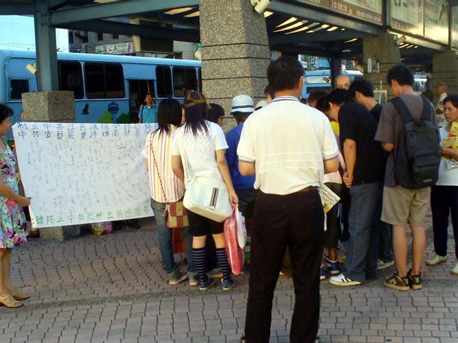 征签活动过程中,很多民众看到江氏集团迫害法轮功学员的图片看板都十分震惊,没想到手段这么残忍,简直是无法无天,很多人主动过来签名,并强烈谴责江氏集团的暴行。市区公车循环站位于基隆港岸边不远的市中心闹区,火车站和长途客运站也在附近,不管何时平常人潮就很多,下午4:30以后人潮更是汹涌,学生和上班族都会在这里搭车。很多人接到传单后就当街阅读起来,南非枪击案虽然台湾媒体没有大幅度报导,但台湾人都很善良有正义感,一听到江氏集团迫害法轮功学员的黑手已延伸到海外,都纷纷签名支持法轮功。