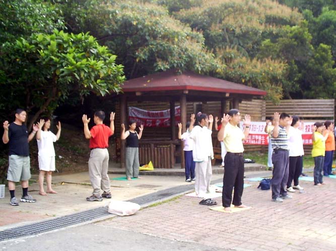 情人湖位于基隆市郊区,风景秀丽,周六清晨踏青的民众很多,晚一点很多外地游客更多,假日整天游客络绎不绝。附近炼功点的学员清早五点就集合在入口处炼五套功法,学员向早起运动的民众介绍法轮功时,一位身体硬朗的老先生说,“我看你们红光满面,气色这么好,就知道法轮功好。”好几位民众当场就想学,学员马上义务教功。很多人看到展板和传单后,都对江氏集团的暴行感到不可思议,不管男女老少纷纷签名同声谴责。