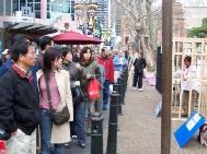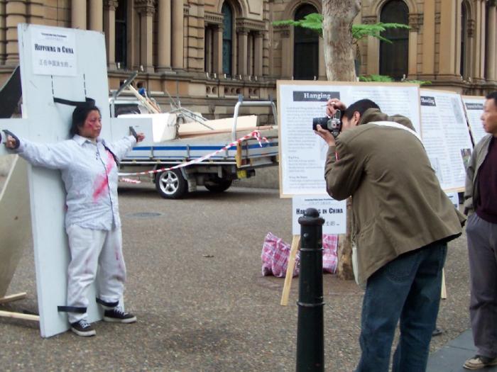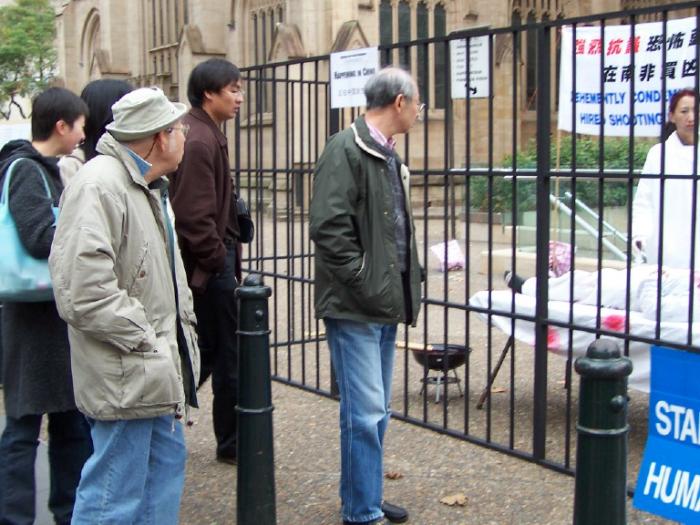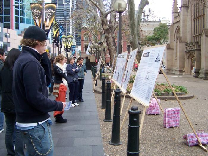 7月正值澳洲寒冬,17日天气异常寒冷,演示酷刑的学员穿着单薄的衣服在萧瑟的冷风中呆了近6个小时。其他学员主动的向行人讲述着中国法轮功学员遭受的迫害,以及南非发生的枪击法轮功学员的恐怖主义暴行。英文不流利甚至不懂英文的学员也默默的发资料和征集签名。他们真诚的用心呼唤着每一个人来共同制止对善良的法轮功学员的迫害和虐杀、停止这场灭绝人性与良知的人类浩劫。他们感动了许许多多的行人,越来越多的人聚集在展位旁,主动要求签名和拿真象材料并拍了许多酷刑展照片。这一天学员从社会各界征得了大量的签名。