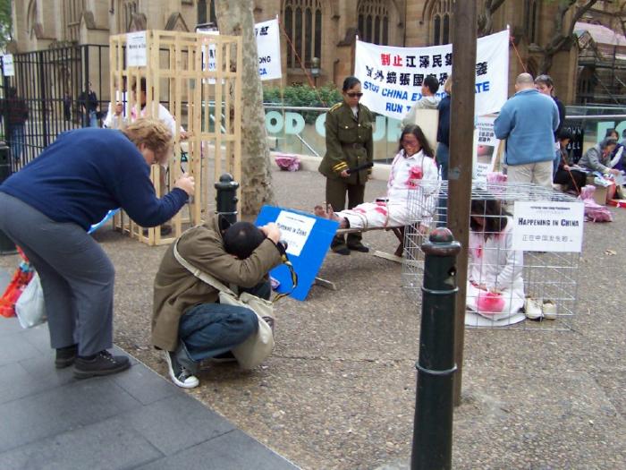 当一位西人中年妇女目睹酷刑场面,泪水夺眶而出,她一边流着泪,一边表示“这太不可思议了!这太可怕了!为什么要如此对待这些善良的法轮功学员?!我不能太久的看下去,因为我无法忍受这一切。”当学员把真象资料递给她时,她立即表示要学法轮功,并要找炼功点。