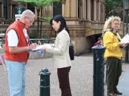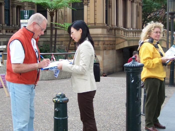 澳大利亚人民爱好和平、憎恨恐怖暴力。当他们感受到法轮功学员的诚意和善良,他们也赤诚的帮助法轮功学员。在一次次的征签活动中,善良的澳大利亚民众给予了法轮功学员巨大的道义支持。
