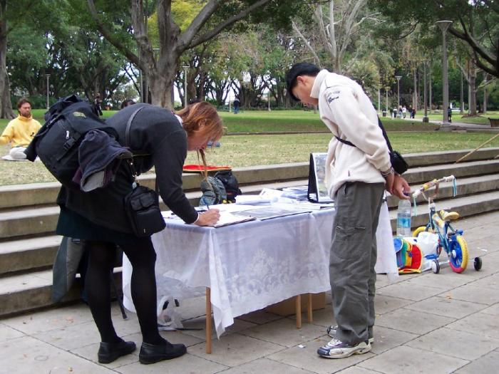 有位西人女士不十分了解法轮功,她不明白法轮功学员的呼吁和努力是否会起到作用。学员向她讲述在中国发生的残酷镇压,并表示没有正义的呼声,没有国际社会的舆论谴责和压力,作恶者会更肆无忌惮的行凶,因为它认为人们不在乎也不关心这件事,这不等于在纵容凶手,默认恶行吗?更何况,它们迫害的是修炼“真、善、忍”的好人,那它打击的不是人最根本的道德吗?那它不是在伤害每一个心怀善念的人吗?听完后,这位女士向学员表示感谢,并签上了自己的名字。