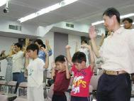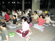 ![]() 大家共同炼功 | ![]() 家长与三位小朋友一起学炼第二套功法 | ![]() 民众观看真象展板 |