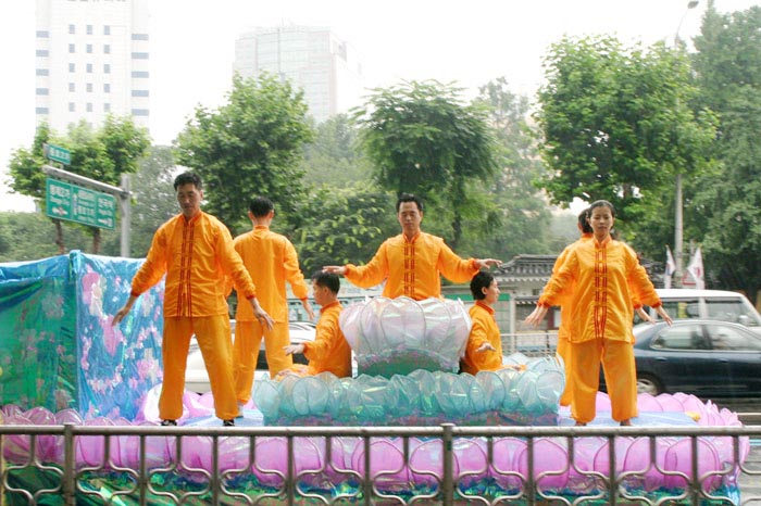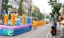 腰鼓队后面是“洪法”队伍和功法演示的车辆,学员们举着大法洪传世界的各式图片和横幅,向市民展示着法轮大法历经五年的狂风暴雨,依然迅速的洪传世界并享有崇高的国际声誉。难怪有两位中国观众惊叹道:“了不得了,法轮功发展的这么快呀!江××怎么可能镇压的了呢!”