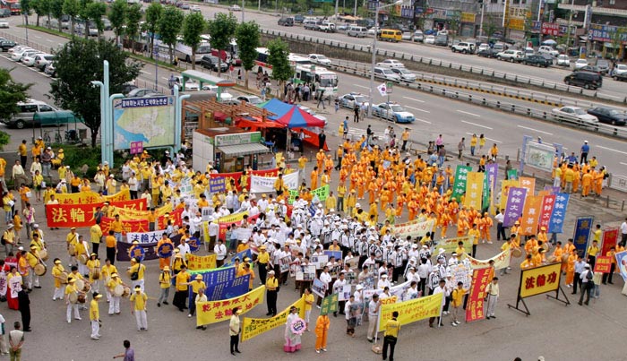 在游行队伍的后面,学员们举着部分被迫害致死的法轮功学员的照片缓缓前行,伴着低沉、悲壮的音乐,真人酷刑演示再次展现在市民面前,很多韩国市民按捺不住激愤的心情,纷纷踊跃接受记者采访,然而,当记者把镜头对向一位中国人时,他无奈的告诉记者:“对不起,我知道法轮大法好,要不怎么会有那么多外国人炼呢?但我不敢接受采访,我知道江××什么事都能干出来,我怕回国后遭到他们报复。”这就是江氏流氓集团在中国人民心中的真实写照。
