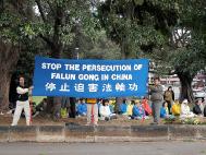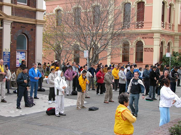 18日清晨8时左右,法轮功学员在市中心附近美丽的维多利亚公园集体炼功,祥和的炼功场面吸引行人驻足观看,许多过往车辆也鸣笛向学员致意。悉尼先锋报记者到现场采访报道,学员向记者介绍了游行的主题并進一步向记者揭露江集团南非雇凶杀人事件。10时左右,游行队伍从公园出发,经悉尼大学和繁华的Newtown地区,于Marrickville市政厅前集会。集会之后,法轮功学员再次大炼功。活动于下午2时左右结束。