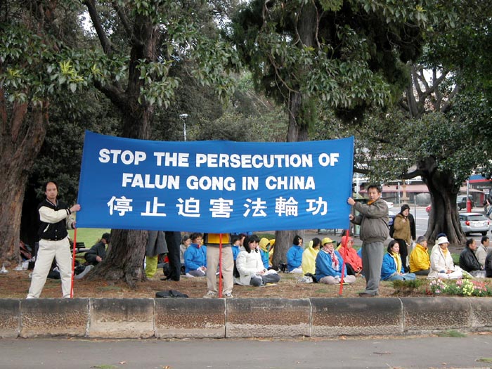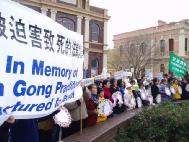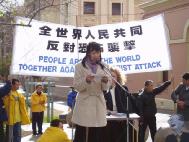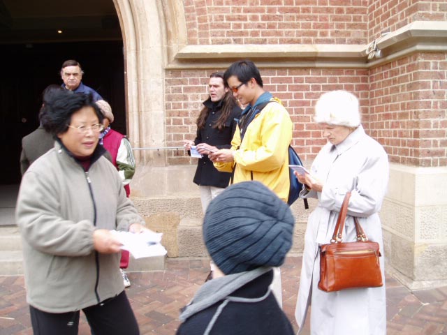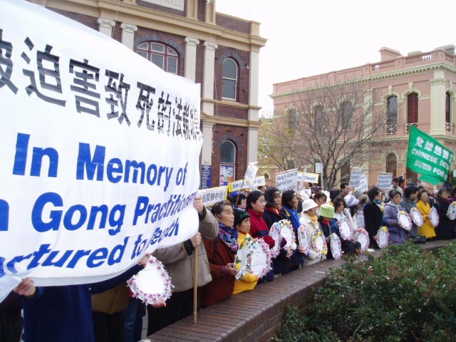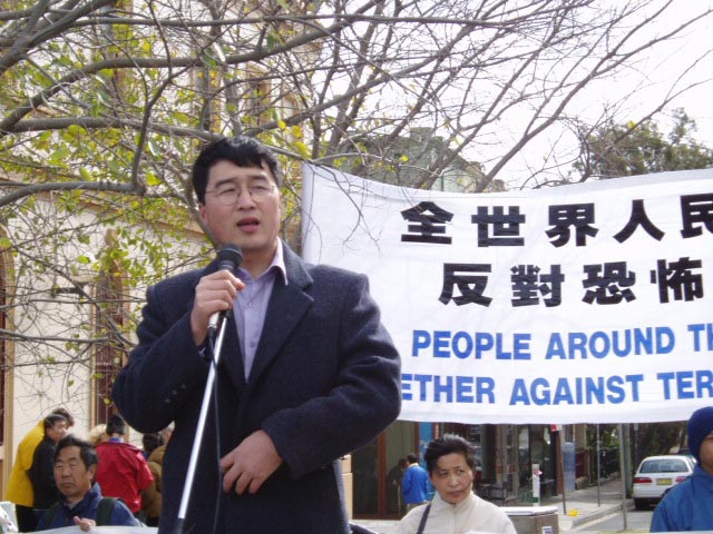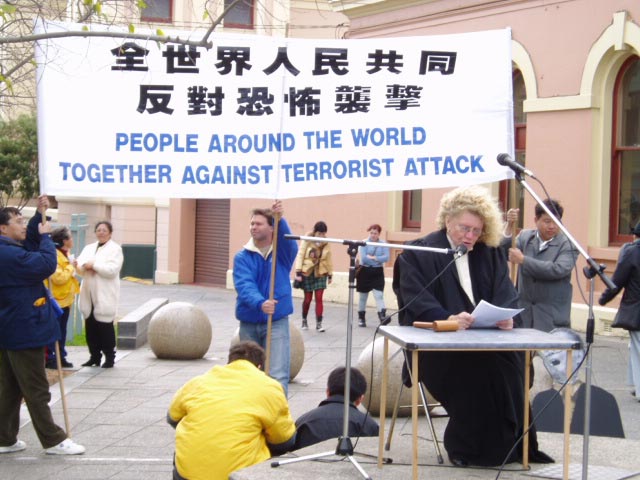 市政厅前的集会由法轮功学员Jonathan Solomon主持。他向本地的市民介绍了法轮功以及江集团对法轮功学员的残酷镇压,他特别提到不久前江集团在南非制造的企图谋杀法轮功学员的恐怖主义行径。江氏集团对法轮功学员的迫害已進入第5个年头。目前,据不完全统计,已有1007名法轮功学员被江集团迫害致死,大多数死于酷刑折磨。Jonathan呼吁所有善良的人们来共同制止江氏恶行。Jonathan在集会上宣读了本地议员安东尼。阿尔巴尼斯(Anthony Albanese)的来信,在信中安东尼议员表达了他对今天游行集会的支持。