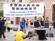 许多人被深深震动了。有位西人青年主动向学员寻问,他如何帮助法轮功学员来制止江氏的恶行。一位老年绅士想要签名来表达他对法轮功学员的支持和对江氏恐怖主义的厌恶。