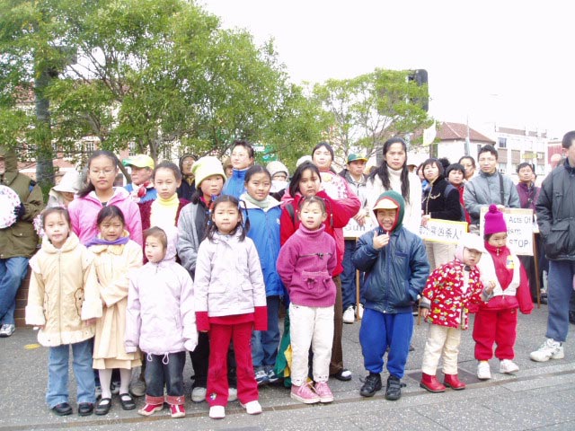 ![]() 市政厅前炼功 | ![]() 集会中明慧小学的小朋友们 |