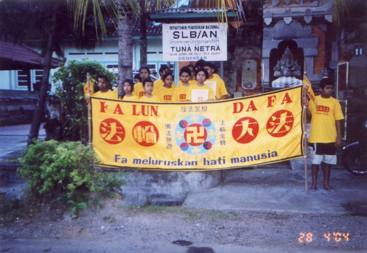 基于这两段经历,我们想,如果把大法介绍给巴厘岛登帕萨(Denpasar)地区的盲人学校岂不更好?在巴厘登帕萨有一个盲人学校名叫Dria Raba。一天,我们和另一名学员到学校介绍大法,出人意料的受到一位教员的热情欢迎,接着他把我们介绍给校长。校长把学校的设施借给我们用于炼功,比如大厅、计算机等等。2003年11月11日星期二,法轮大法第一次被介绍给了这些孩子以及一些教员。那时,因为孩子们看不见,我们教功遇到了困难。为了让他们学习炼功动作,我们一个个手把手的教。那时孩子人数比到那儿教功的学员多,但我们还是一个一个的教。然后,每星期二在学校的大厅里一起炼功。随着更多的学员来辅导孩子们动作,在几次炼功后,有了些進展。