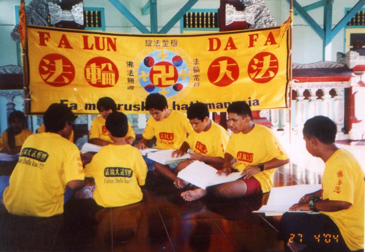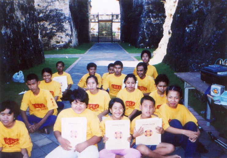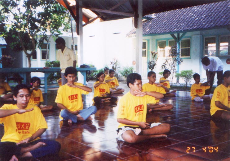 读过几遍《转法轮》后,2004年4月27日,孩子们第一次一块儿学印度尼西亚文盲文版的《转法轮》。有16个孩子炼功,包括7名小学生,3名初中生,5名高中生,以及一名2003年毕业生。16个炼功的人中,8人是男生,8人是女生。