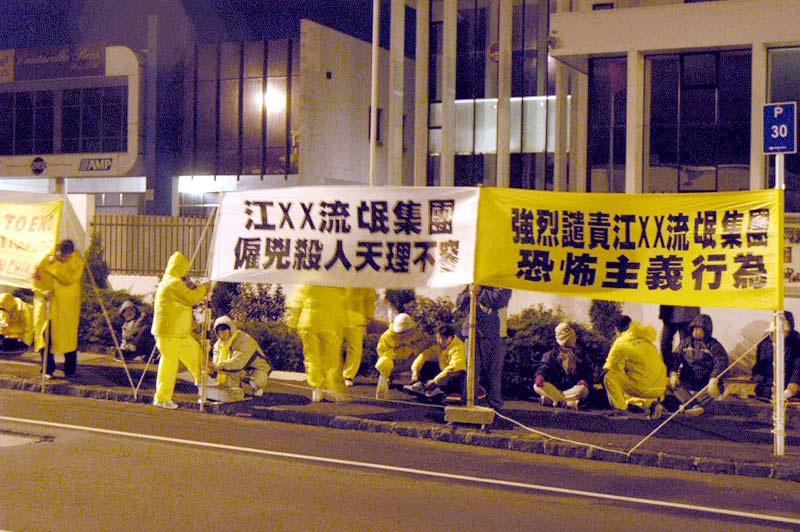 【明慧网2004年7月2日】新西兰奥克兰时间6月30日晚8:00时至10:00时,整个奥市被狂风骤雨笼罩着。奥克兰市大法弟子惊闻南非枪击事件发生,齐到奥市中领馆前发正念,清除邪恶。图为大法弟子们在风雨中发正念,打横幅。