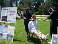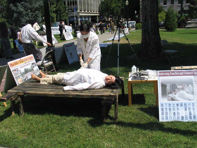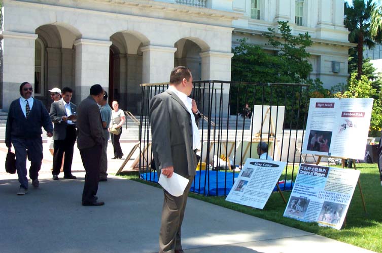 来自沙加缅度和旧金山湾区的法轮功学员29日上午,在州政府的办公楼前开始了连续两天的酷刑演示,学员们打着“正在中国发生”的横幅,告诉人们这是在中国大陆实实在在发生着的事情,是法轮功学员所面临的遭遇。