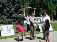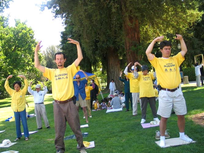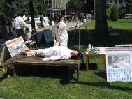 两天来,参加活动的学员们克服困难,不畏劳苦,在沙加缅度那夏日的骄阳下,祥和的炼功,派发真象资料,打横幅。化装演示的学员,无论是扮演受害者,或警察,都认真对待。学法交流中,学员们体会到,我们的表演要不断的提高,努力把它演得逼真,使人触目;同时要相互提醒,时时保持正念,用大法修炼者那慈悲的力量,真正的去打动更多的世人。
