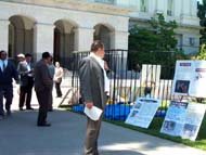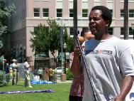 伴随着学员的解说和图片说明,来来往往的路人,有的驻足倾听,有的仔细阅读,有的坐在学员炼功场地久久不愿离去,有的帮着学员打横幅。一位在附近上课的黑人小伙子Johnny,课后路过这里,被这儿的一切所震惊,他说,“我简直不敢相信自己的眼睛,我看到的这样祥和美好的炼功人,竟会受到如此的迫害,而它却是发生在2004年的今天。”第二天,Johnny又来到这里,他已经从附近的一家图书馆借到了一本《转法轮》。他恳切的问道,“我能做些什么?我真想做点什么。” Johnny在新闻发布会上发了言,他说,“这里的反酷刑展,让我想起了纳粹的集中营,我还不知道我能做什么,但是我觉得,全世界人都应该关心,我们一同阻止,不能让它再发生。”