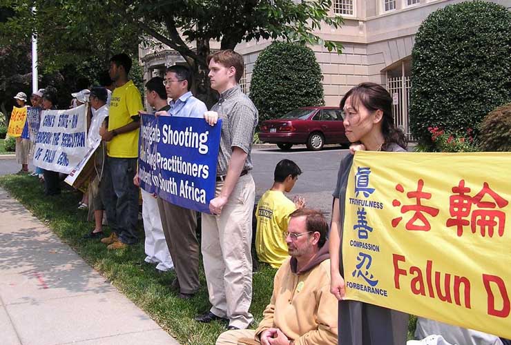 法轮功学员在烈日下展开“法轮大法好”“世界需要真善忍”“强烈谴责江泽民集团南非雇凶杀人”等横幅,并展示了遭枪击学员的照片。