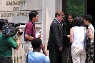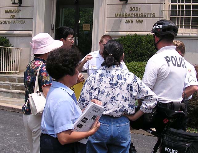 ![]() 南非驻美使馆前 | ![]() 媒体采访 | ![]() 向警察讲真象 |