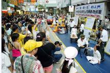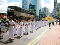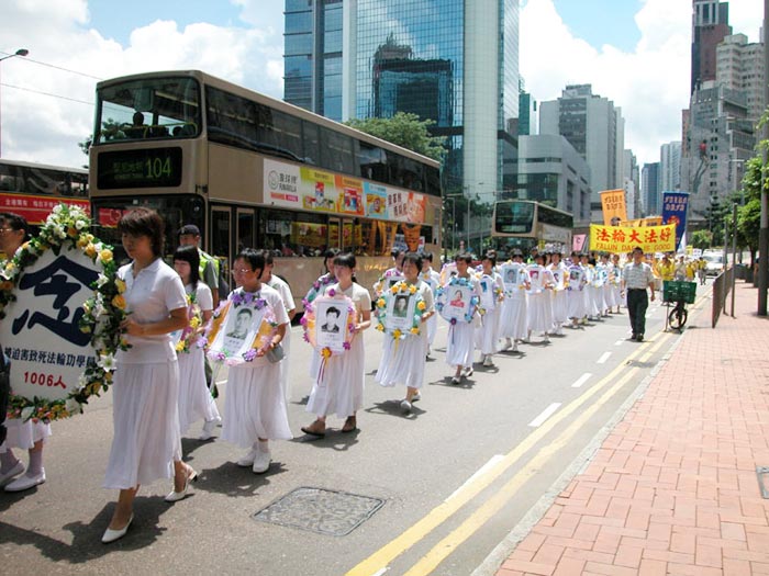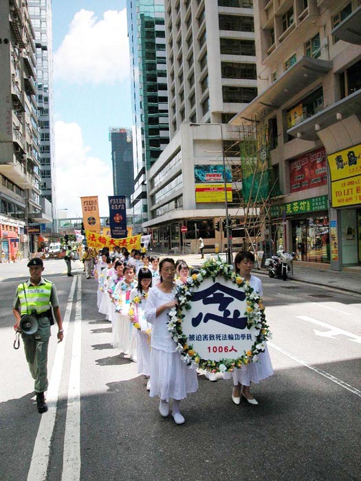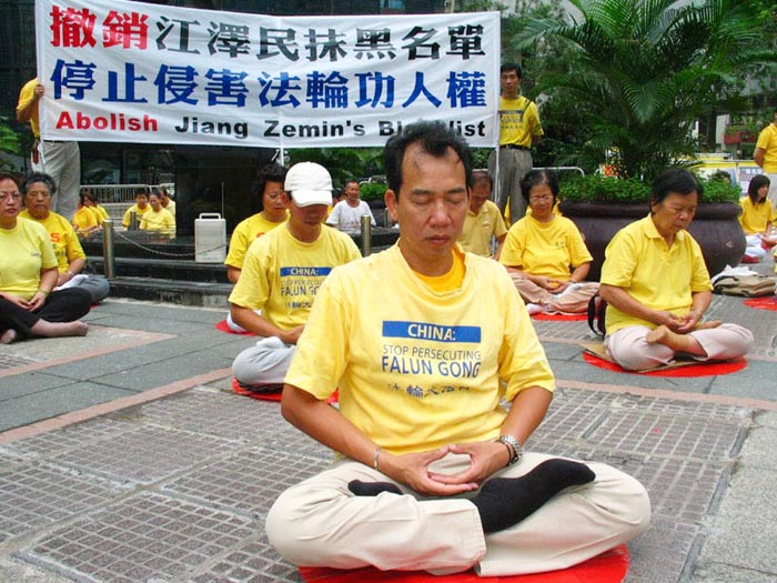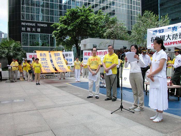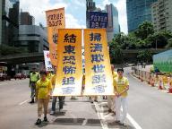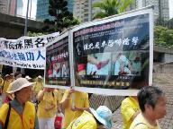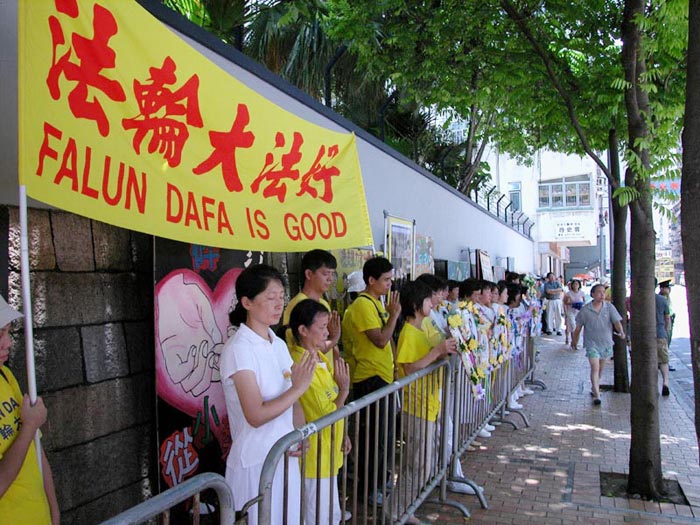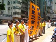 【明慧网2004年7月20日】2004年7月18日,香港200多名法轮功学员在入境处大楼外進行集体炼功,其后并游行到中联办,呼吁政府及民众帮助制止及结束大陆江氏流氓集团对法轮功长达五年的恐怖
