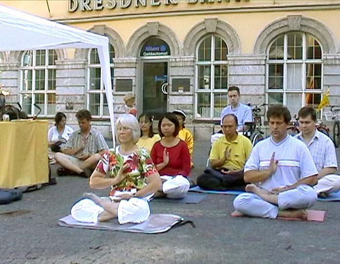 由于这个城市的法轮功学员定期到市中心去炼功,发资料并配合办咨询日活动,人们很熟悉他们。很多人高兴的走过来告诉学员:我已经看过你们的资料了,有新资料吗,在哪可以炼功?还有人和学员一聊就是一个多小时不愿离开。尤其是当女士们和小孩们接到印有“法轮大法好”的书签和明信片时,如同得到心爱的礼物一样高兴和感激。有一位漂亮的德国小女孩见学员打坐,她也要炼,一坐就很长时间,一动不动,等大家结束了她仍然十分入静的继续打坐,旁人很难相信她是第一次炼功,大家都为这位有缘份的女孩高兴。