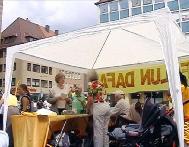 过往行人还不时被悠扬美妙的笛子独奏曲所吸引,德国法轮功学员陈国华特意从其他城市赶来为这个咨询日吹奏法轮功学员创作的音乐。他演奏的“得度”,“天韵舞春风”,“共神游”……使很远的路人驻足倾听,这么美妙的笛声来自何方?寻声望去,啊,来自法轮大法的咨询日。当人们走近信息桌了解真象时,无不为这场骇人听闻的迫害而感到悲哀,他们中有人默默去签名,有人鼓励学员们坚持下去。一位来自刚果的非洲人听说法轮功学员在南非遭到江氏集团雇凶枪击时,二话不说在征签表上签了名。