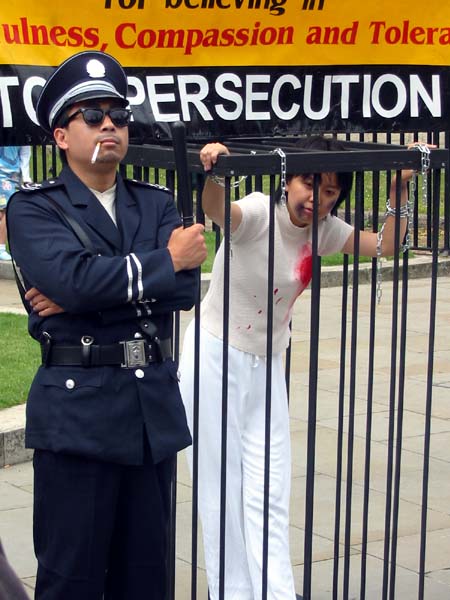 法轮功学员演示的酷刑包括强行堕胎,吊打、老虎凳、烙刑、钉子笼等近十种。在每一种酷刑展示的旁边,摆放着每种酷刑的图片和文字介绍。与残暴的酷刑形成鲜明对比的是在一旁展示祥和功法的法轮功学员。与此同时,一名西人学员向过往路人逐一介绍所展示的每种酷刑,并告诉人们法轮功在中国遭到的迫害。