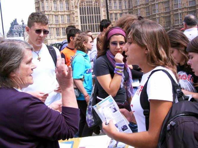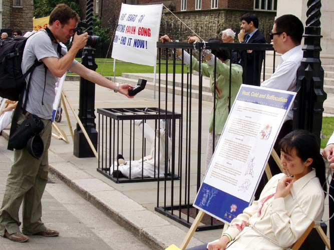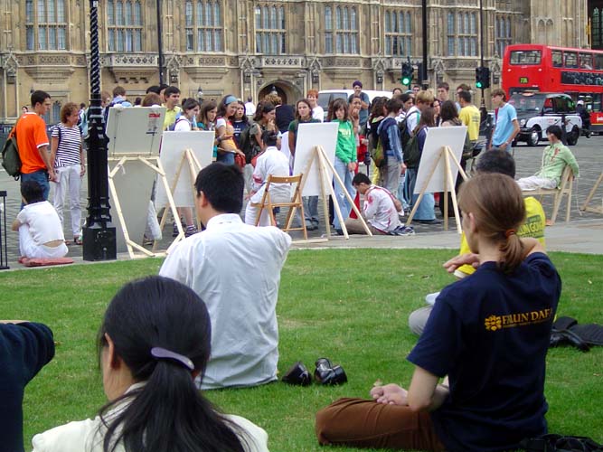 上议院大厦位于著名的大本钟及国会大厦附近,每天行人如织,络绎不绝。当来自世界各地的游人拿着相机在美丽庄严的建筑群中流连忘返时,突然看见这一幅幅触目惊心的血腥迫害,人们的震惊是可想而知的。