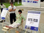 二十几张大展板一字排开,以图文并茂的形式向人们讲述着发生在中国的迫害,再配以真人摹拟表演,在演员专心的投入,合理的道具安排以及专业化装师的共同努力下,效果强烈震撼着人们,在民主自由国度里长期生活的人们简直无法接受如此残酷暴行的再现,于是当地警察一再希望学员们能减弱表演的惨烈程度,以免惊吓了过路的儿童,由此可见江氏流氓集团是多么恶毒,在英国连表演都让人难以承受的事,在中国却真真切切的发生了,而且是一个接一个,直到现在。