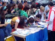 活动前学员们在学法交流中认识到,我们活动的主题不仅是揭露中国正在发生的残酷迫害,更是为了展示大法弟子不屈的崇高精神和真善忍的伟大力量。记得我们刚开始讲真象时,许多世人及政治家们问,现在世界上到处都有血腥迫害,为什么我们要特别关注法轮功呢?法轮功有什么不同呢?这场“酷刑迫害与宇宙法理的撞击”展览就是为了回答人们这个问题。在展示残酷折磨的同时,我们也向人们传达了大法的美好与纯正,这一反一正一恶一善的强烈对比,让人们很容易就认清了江氏流氓集团的邪恶,于是人们主动在全球审江的签名表上签字,许多电视台的记者和报社记者也前来采访,学员们主动上前向人们讲解真象,几千份资料很快就发放一空。人们明白了,乌云是遮挡不了太阳的,在酷刑迫害与宇宙法理的撞击中,真理是永存的,任何企图动摇人们正信的暴力酷刑都是徒劳无益的。